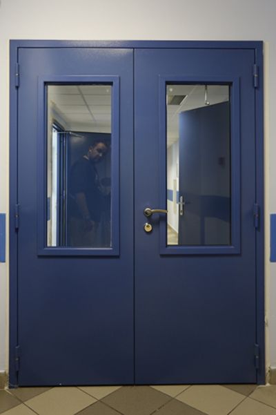 Противопожарная алюминиевая дверь синего цвета в Солнечногорске