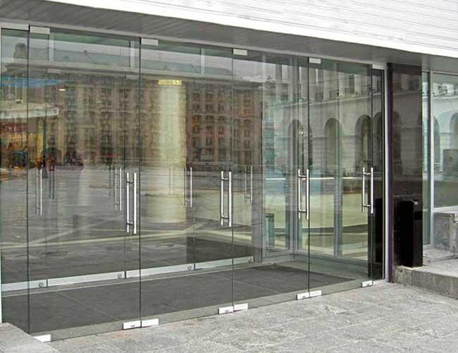 Противопожарная безрамная дверь со стеклом в торговый центр в Солнечногорске